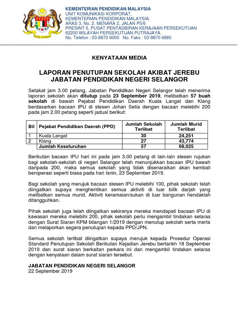 Https Www Moe Gov My Images Kpm Ukk 2019 09 Sep Media Laporan Penutupan Sekolah Akibat Jerebu Di Selangor 8 Pagi 18 Sept 2019 Pdf