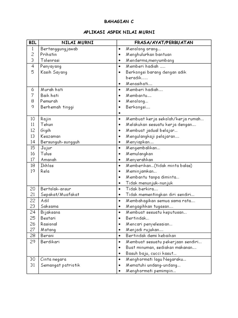 Bahagian C Aplikasi Aspek Nilai Murni Bil Nilai Murni Frasa Ayat